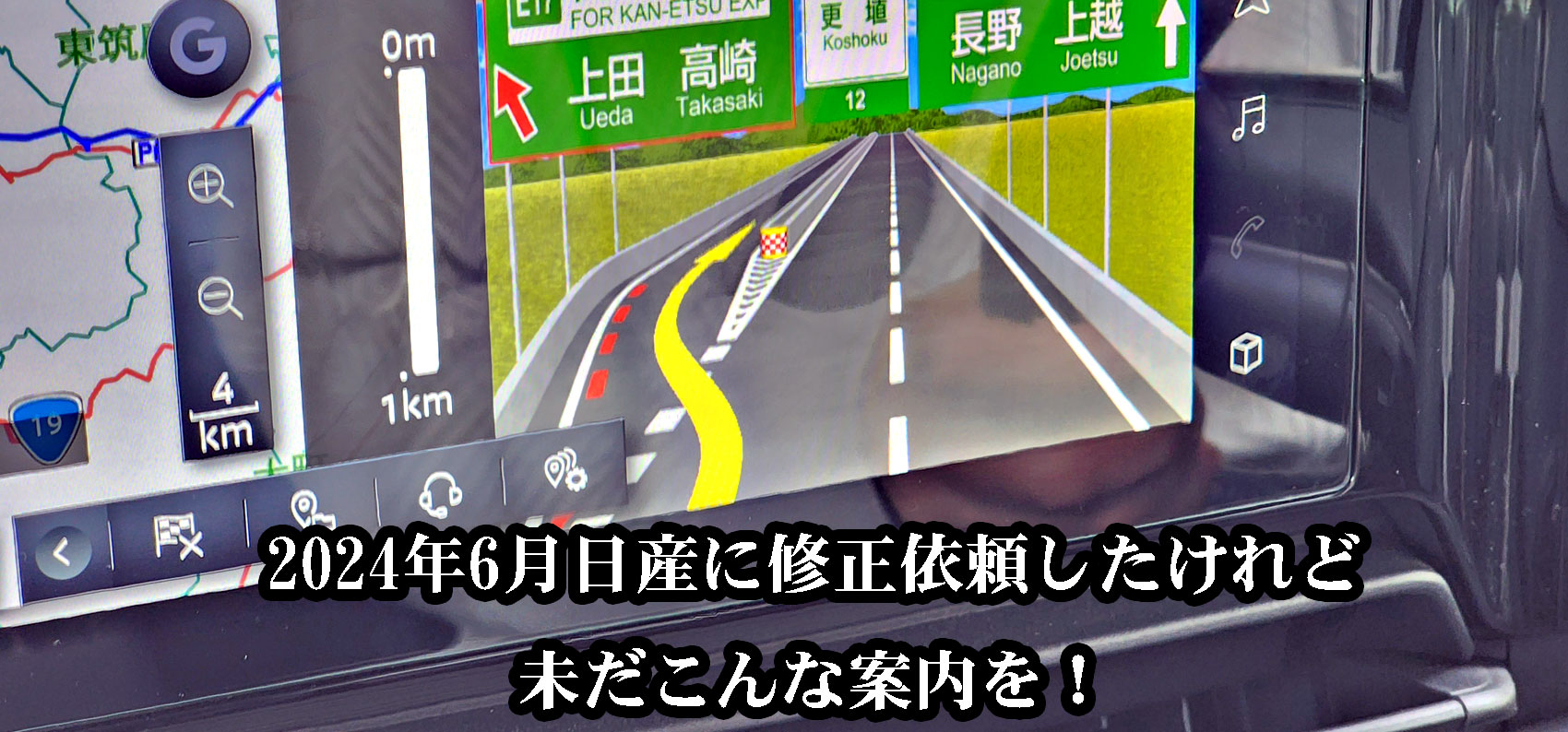 日産CONNECT&ナビ不具合事例多発・その12 2025年03月13日 《日産CONNECT&ナビ不具合事例多発》その122024年6月18日に起きた長野道更埴ジャンクションでの摩訶不思議案内がいまだ解消されない日産!※去年6月に日産ナビ担当部署に電話で修正依頼済みなのに・・・前回現象はイメージ図だったが今回は管理人助手席だったのでナビ摩訶不思議案内を撮影できました2024年12月14日九州山旅から帰宅途中にまたしても2024年6月18日の事例管理人運転中の為イメージ図での説明日産コネクトナビでこのようなヘンテコ案内ありましたと日産担当部署宛に電話したけれどお客さんからの注意喚起は無視するのが日産の体質かも・・・★ライブドア・該当ブログ記事https://canada2194.blog.jp/archives/28443410.html★Ameba・該当ブログ記事https://ameblo.jp/canada2194/entry-12856564331.html?frm=theme日産コネクト&ナビシステムは年間7920円有料プランにもかかわらず納車後数ヶ月の間に「信用できない案内事例が多発」したため、日産ナビシステム担当部署に改善を求める意味で2024年6月12日に当サイトを立ち上げました 「日産CONNECTナビ不具合事例集(24年式・セレナ)」カテゴリの最新記事 < 前の記事次の記事 > コメント コメントフォーム 名前 コメント 記事の評価 リセット リセット 顔 星 情報を記憶 コメントを投稿する